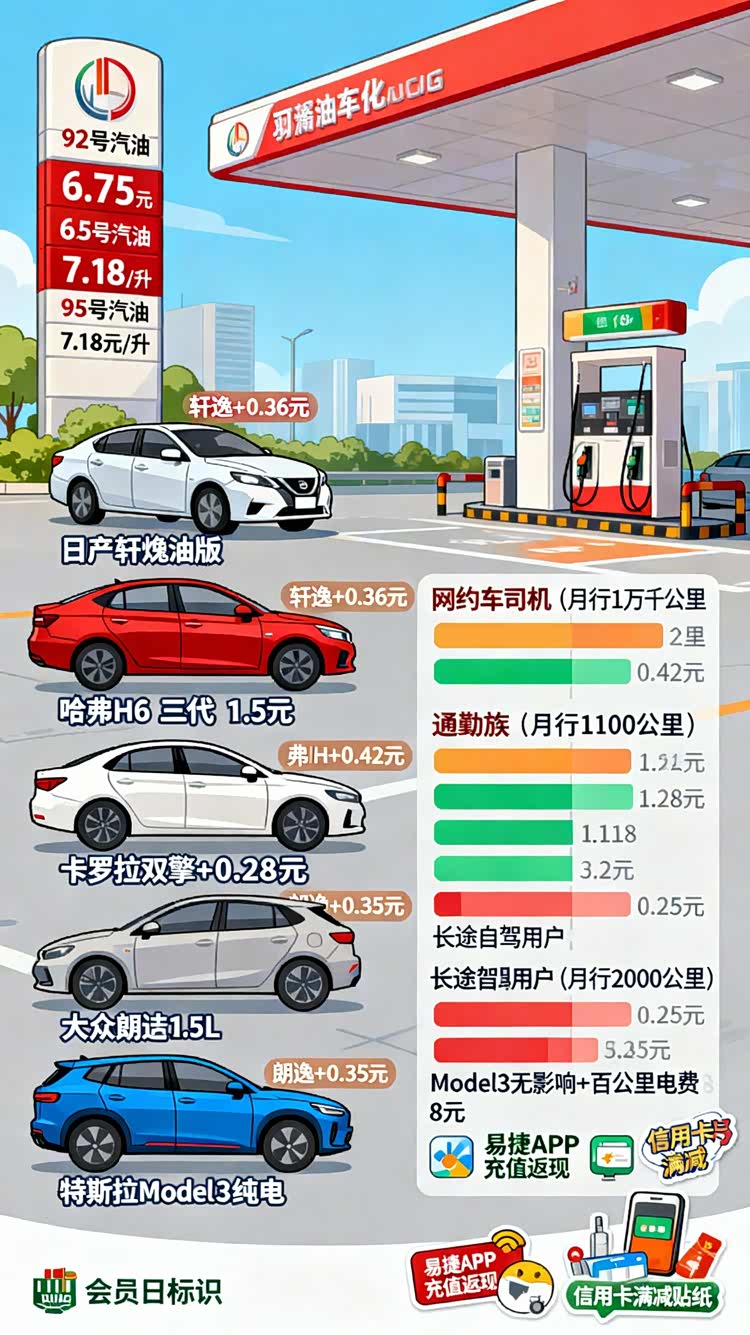 多家加油站推出优惠活动缓解压力。中石油每周三、五会员日92号汽油优惠0.3元/升,加满50升可省15元;中石化“易捷加油”APP充1000返50元;民营加油站错峰加油(10:00-16:00)优惠0.4元/升;部分银行信用卡加油满200减20元。这些策略可有效抵消部分调价影响。