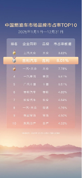 但年底的销量榜一公布,吉利中国星这个燃油车矩阵,居然不声不响卖了超过121万辆车。更夸张的是,这已经是它连续第九年当上中国品牌燃油车的销冠。