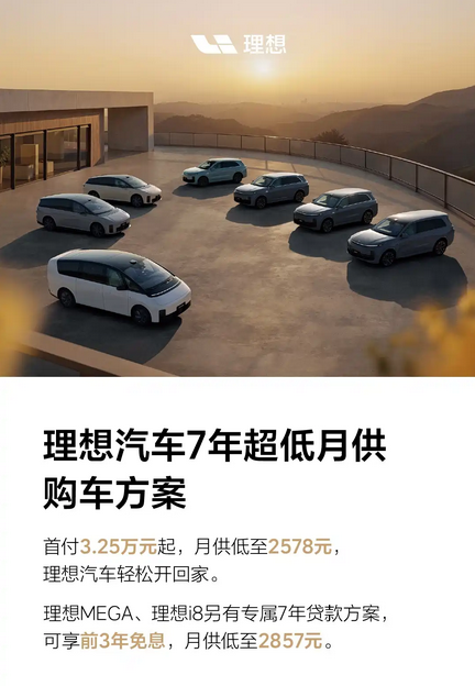 日前,理想汽车推出7年超低月供购车方案,首付3.25万元起,月供2578元, 理想MEGA(参数|询价)、理想i8另有专属7年贷款方案,可享前3年免息,月供2857元。理想汽车此次推出的7年超低月供购车方案,本质上并非简单降价,而是通过拉长金融周期、降低前期现金支出,重构家庭购车的现金流模型。首付门槛下探至3.25万元,月供控制在2578元区间,使原本需要一次性投入较多资金的中大型新能源车型,进入更宽泛的家庭预算体系。这一变化,对于首购新能源、换购家庭用车的用户具有直接影响。