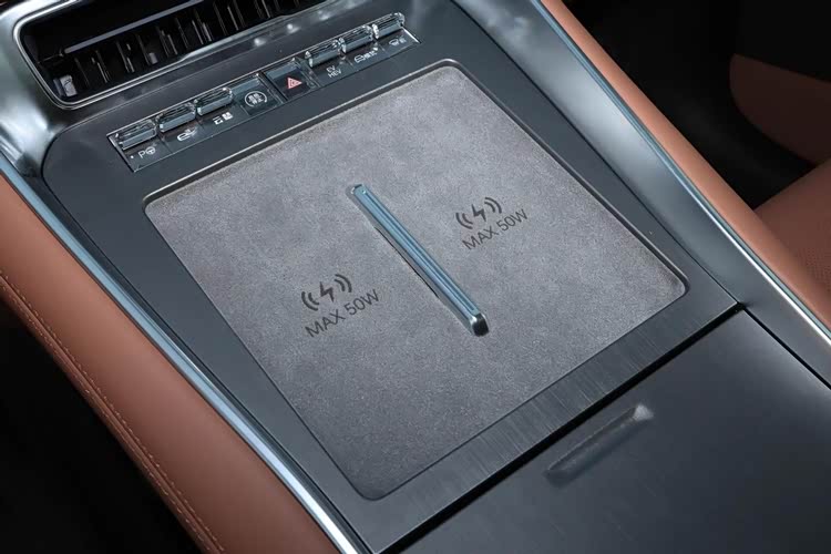 腾势N8L DM的内饰,传承了家族化的简约时尚风格,大面积使用了皮质材料,搭配精致的双线绗缝工艺,加上银色镀铬和黑色饰面板等元素,车内的用料还是相当扎实。两辐式运动方向盘,采用皮质材料包覆,手感体验还是较为舒适,附带的加热、记忆功能,也为驾驶者增加了便捷性。换挡方式采用新能源车常用的电子式怀挡,就布置在方向盘右边位置,驾驶者盲操更方便,同时也为中控岛台区域,腾出了50W手机无线充电面板的位置,再无需担心没带手机充电器了。