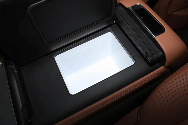 其它配置方面,腾势N8L DM还配备了车载冰箱、车内香氛装置、流媒体内后视镜(高配)、128色主动式环境氛围灯、帝瓦雷音响、原厂ETC等配置,其中车载冰箱有11L,具备-6℃-15℃制冷,和35℃-50℃制热,大概能容纳18罐370ml的可乐,反正一年四季都能享受到适温的饮食。