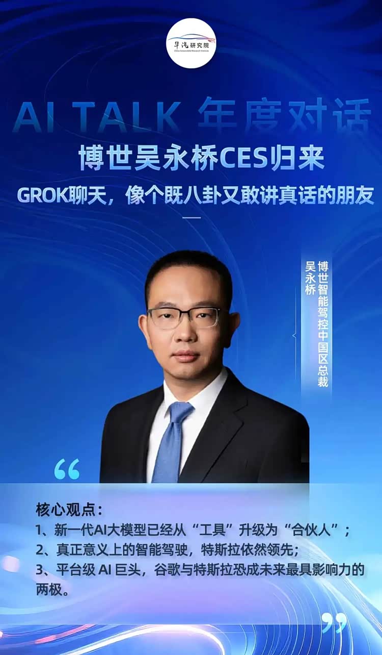 2026开年,华汽研究院希望围绕 CES 做一轮聚焦“算力、AI 定义汽车,以及从汽车延展到可穿戴和机器人”的 AI Talk 访谈。 在FSD、算力竞赛和 AI 大规模部署逐渐成为行业主线的背景下,本期对话,我们邀请到博世智能驾控中国区总裁吴永桥,希望呈现企业如何在这场变局中形成各自的战略共识与非共识。