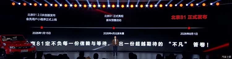 2025年8 月1日,北京越野正式官宣BJ81项目启动,明确采用BIP造车模式,让用户全程参与产品从0到1的研发过程,公开开发进度、决策逻辑等,收集用户建议并融入产品设计,同时宣布新车计划于2026年8月1日上市,研发周期为12个月。10月1日,BJ81概念车在北京奥林匹克公园首次公开亮相,随后开启覆盖北京、成都、重庆、西安等9城的巡展活动。2026年1月,BJ81完成1.0共创版到2.0共创版的升级迭代,2.0共创版在外观、配置和性能上进一步优化。