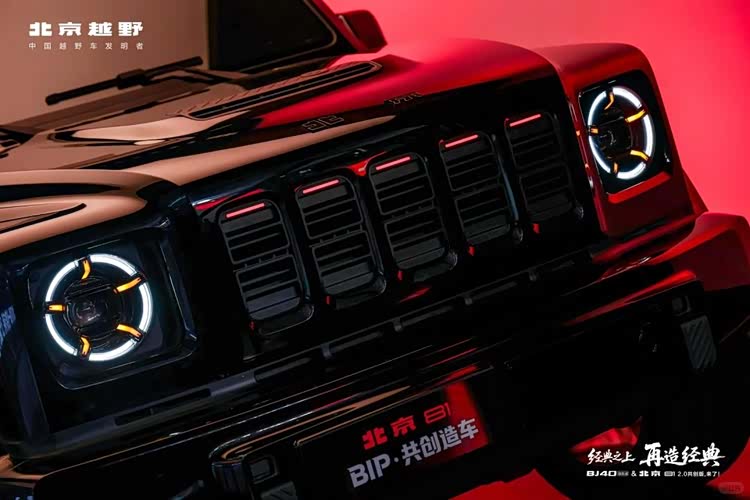 北京81脱胎于BJ80,外观方面延续北京越野最新的方盒子设计语言,北京81 2.0共创版相比1.0版本,其前机舱盖的凸起略有收敛,前脸配备经典的五孔式前格栅,中网内部的每一个孔内都镶嵌了一个红色的LED灯组。新车两侧大灯组采用类似“天圆地方”的设计理念,方形的外壳搭配圆形的灯组,同时使用了五条间断的曲线LED+五条穿插其中的转向灯组,细节上用尽了“数字5”的设计概念。
