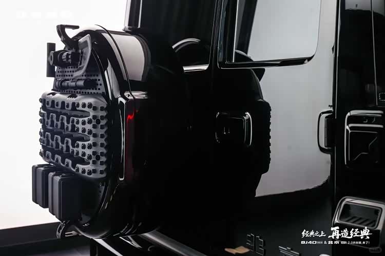 车身侧面,新车整体比例较为修长,但依旧呈现见棱见角的方盒子设计理念。新车腰线贯穿侧面,前后侧翼子板搭配了外扩样式的轮眉造型,同时还配备了全新设计的双七条辐轮圈,内置红色制动卡钳,整体造型非常动感。车尾部分,新车在车顶末端内嵌了五个间断的高位刹车灯组,后备厢采用了双开门设计。新车尾灯组采用四个方形设计,后包围造型也更加宽厚,并带有拖挂钩。同时,根据用户的共创需求,2.0版本将后备胎修改为外挂式的储物盒。