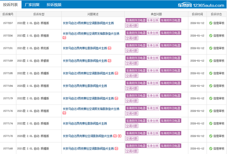 猫头鹰车志(ID:owlauto)讯,第三方汽车投诉平台车质网显示, 长安马自达3(参数|询价)昂克赛拉近期遭遇车主集体投诉,核心问题为空调膨胀阀固定垫片/卡扣生锈,涉及2020款至2023款车型,车主纷纷呼吁厂家启动召回并免费解决问题。