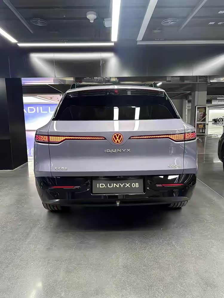 与众08的尾部显得非常厚重,横向折线丰富了层次,车顶末端留有扰流板和高位刹车灯,而狭长的晶耀点阵式尾灯与前灯组做到了很好的呼应,并且金色尾标同样可以点亮,大面积的亮黑色后包围进一步增强运动元素。
