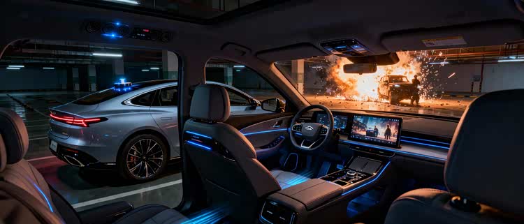 深夜地库场景下,车载影院模式开启后,风云A9瞬间变身私人4D影院。座椅会随着影片中的爆炸、撞击等情节同步震动,23扬声器系统则精准还原每一个音效细节——从雨滴落在车窗的清脆声到引擎轰鸣的低沉震颤,全方位包裹的声场与座椅震动联动,带来身临其境的观影体验。静谧的地库环境隔绝了外界干扰,让用户在私密空间里享受独属于自己的娱乐时光,这种场景化的体验设计,让汽车不再只是出行工具,更成为了移动的生活空间。