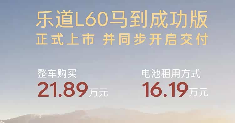 车家号·0浏览·2026-01-20 17:25 · 重庆2026年1月16日,蔚来旗下乐道品牌正式宣布, 乐道L60(参数|询价)马到成功版上市并同步开启交付。作为一款主打马年主题的特别版车型,新车提供整车购买和电池租用两种方案,整车售价21.89万元,选择电池租用方式购买售价16.19万元,该车已同步开启交付。