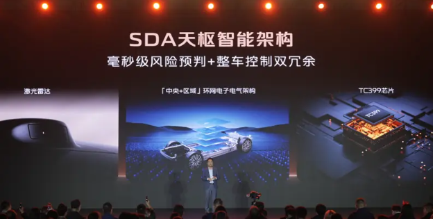辅助驾驶方面,基于SDA天枢智能架构,搭载激光雷达,采用SDA“中央+区域”环网电子电气架构,左右区域控制器均搭载英飞凌旗舰“芯”脏TC399,实现毫秒级风险预判+整车控制双冗余。