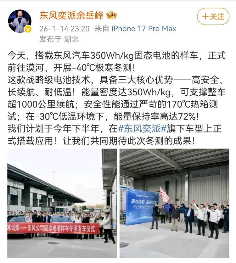 他表示:搭载东风汽车350Wh/kg固态电池的样车,正式前往漠河,开展-40℃极寒低温冬测,这款电池具备高安全、长续航和耐低温三大优势,能量密度可达350Wh/kg,支撑整车超1000公里续航,在-30℃极寒低温情况下,能量保持率达72%,计划今年下半年正式搭载应用。