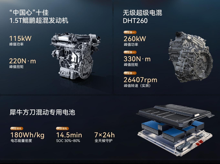 动力方面搭载的是1.5T插混系统,匹配的是鲲鹏超能混动CDM系统,其中发动机可输出115kW的最大功率,系统综合功率最高可达260kW,高配四驱版本零百加速可达5秒级。电池方面,目前申报的电池容量分别是19.527kWh、32.659kWh,纯电续航101km、170km,官方CLTC纯电续航最长是230km。