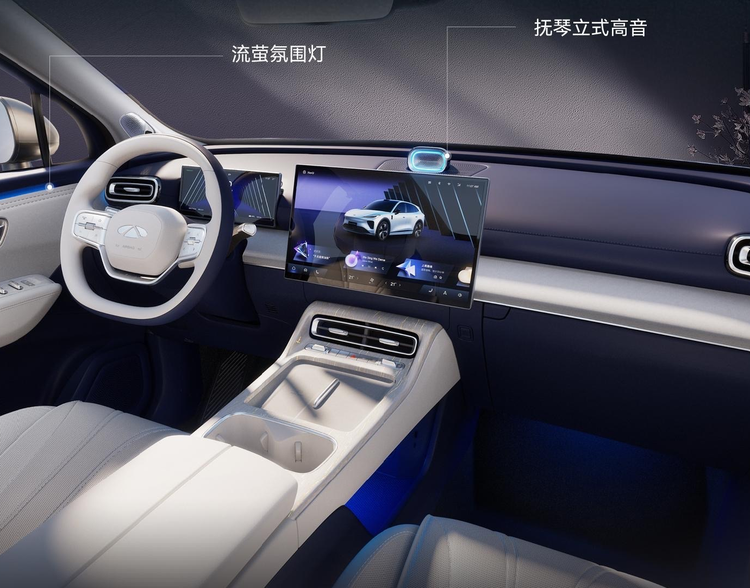 内饰布局比风云T9更加简约,配备了17.3英寸悬浮式中控大屏幕,屏幕后端是凸起的音响系统,仪表盘也采用了悬浮式设计,中央岛台配备了双手机无线充电面板,面板前端是一排规整的物理按键,水杯架采用横向布局。中控台为双层布局,在双拼配色加持下有着不错的质感。