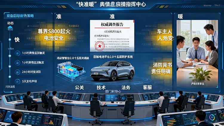 车家号·0浏览·2026-01-20 18:07 · 北京2026年1月14日,重庆两江新区一台 尊界S800(参数|询价)车辆后排扶手箱处突发冒烟起火,现场人员迅速处置后火势扑灭。作为华为与江淮合作的超豪华电动车型,该事件迅速引爆网络,“电池安全”“智能汽车风险”等话题成为讨论焦点。5天后的1月19日,鸿蒙智行发布官方声明,以清晰结论和周全措施快速平息舆情。这一事件不仅是危机处理案例,更折射出智能汽车时代车企舆情管理的新逻辑。