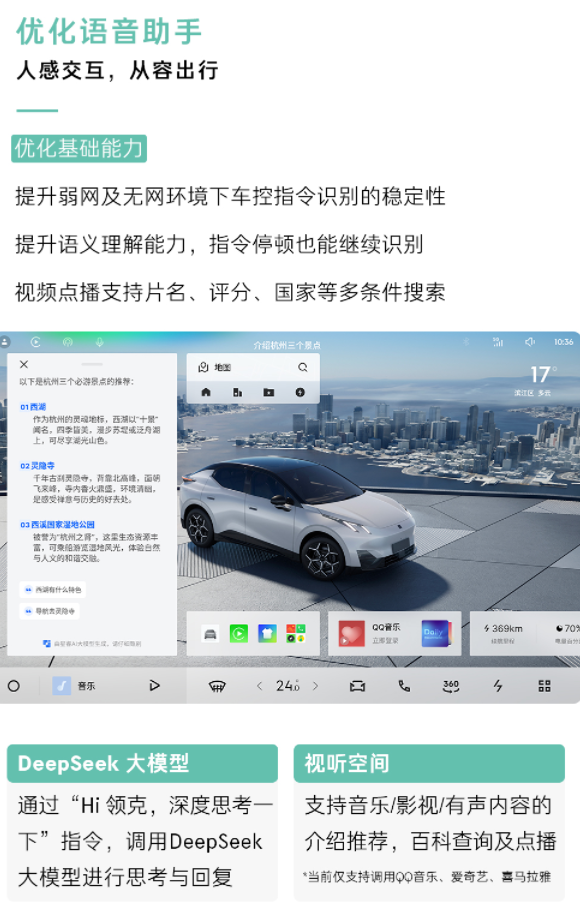 用户现在可以用更加口语化的方式与车辆进行沟通,系统能够理解并执行复杂的指令,甚至在特定场景下主动给出“猜你想问”的提示,减少了用户的反复操作。通过“Hi领克,深度思考一下……”这一指令,用户还可以直接调用DeepSeek大模型进行分析式回复,让语音交互更加深入和智能。在情绪价值层面,新增的“AI音乐律动”功能进一步增强了车内的沉浸感和陪伴感。系统会根据歌曲的节奏与意境生成专属MV画面,并联动氛围灯的变化,为用户带来更加丰富的视听体验。
