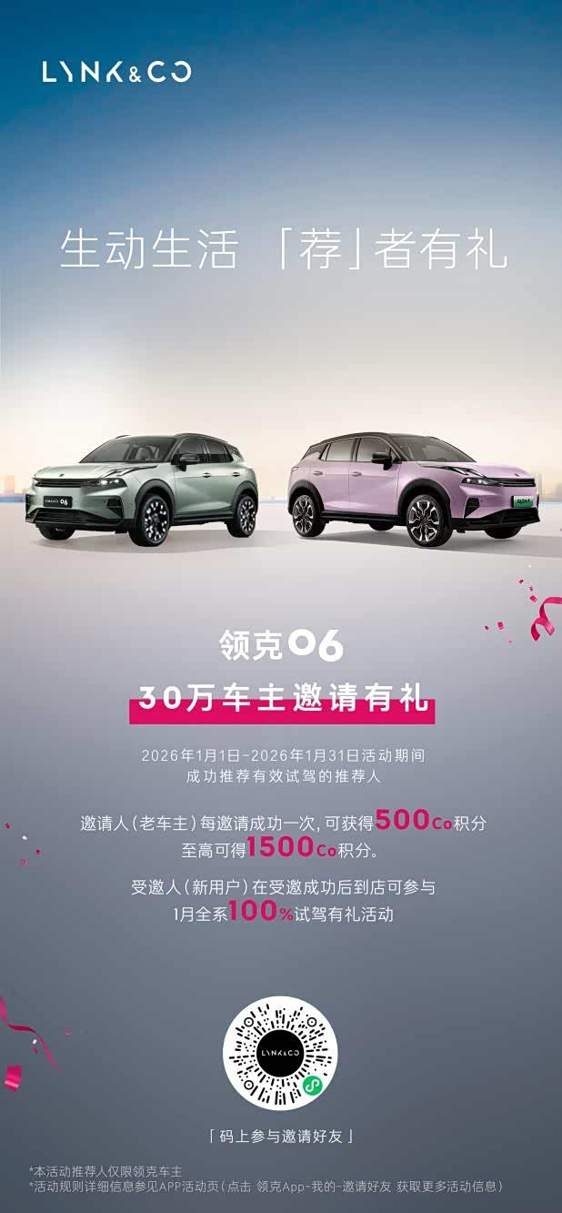 领克06深知,真正的成功不仅仅在于产品的销售,更在于与用户建立深层次的情感连接。因此,领克06在营销和用户生态构建上积极融入年轻圈层,通过跨界电竞、联名影视IP以及推出Shero系列等方式,与用户玩在一起,共同构建了独特的品牌文化。为庆祝全球交付30万台的里程碑,领克推出了30万车主邀请有礼政策,老车主成功推荐新用户试驾,邀请人每成功一次可获得500Co积分,至高可得1500Co积分;受邀新用户到店则可参与全系100%试驾有礼活动。