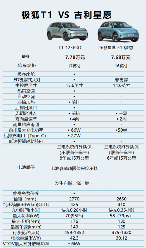 安全与质保政策上,极狐T1 425PRO版提供三电系统终身质保(不限首任车主),电池质保8年或15万公里,且承诺电池衰减超限值只换不修、自燃烧一赔一,用户用车更安心。星愿310梦想版同样提供三电系统终身质保(限首任车主),电池质保为6年或15万公里,保障力度可圈可点,但极狐T1的"不限首任车主"政策与更长的电池质保周期,显然更具长期使用价值。