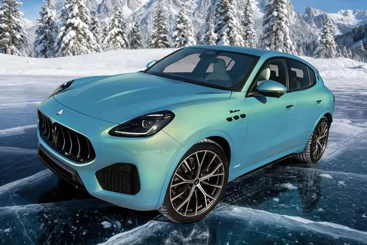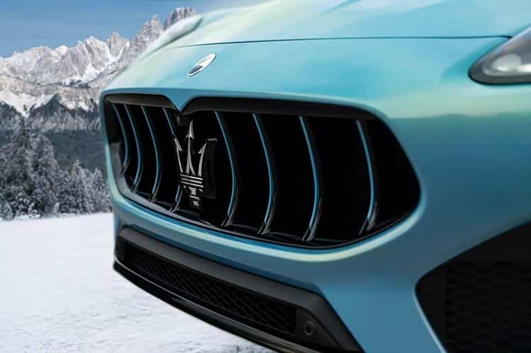 Grecale Cristallo 特别版最特别之处在于采用由 Fuoriserie 定制部门专为本车精心调制的全新 Azzurro Aureo 冰蓝色涂装,在经典的 玛莎拉蒂 Blue 玛莎拉蒂蓝之中加入云母金点缀,进而呈现出有如冬日暖阳洒落在白雪皑皑之上的视觉效果。在此同时,车头水箱护罩的直栅饰条也加入 Azzurro Aureo 车色点缀,脚下则升级搭载 21 寸 CRIO 多辐式钻石切削铝圈,进一步强化整体运动化跑格。