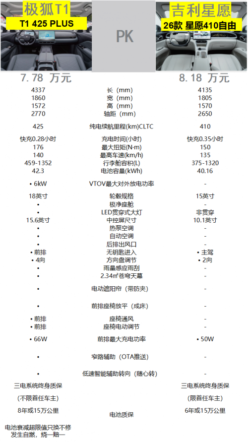 极狐T1 425PRO版还拥有2.34m²超大全景天幕,采用双层高强度半钢化隔音玻璃,通透防晒又安全。搭载的全开式电动遮阳帘,可隔绝99.9%的紫外线,还自带防夹功能,可手机APP远程控制。此外,极狐T1 425PRO版提供三电系统终身质保(不限首任车主),电池质保为8年或15万公里,电池衰减超限值只换不修,还有自燃烧一赔一的保障。吉利星愿310梦想版也不错,提供三电系统终身质保(限首任车主),电池质保为6年或15万公里。