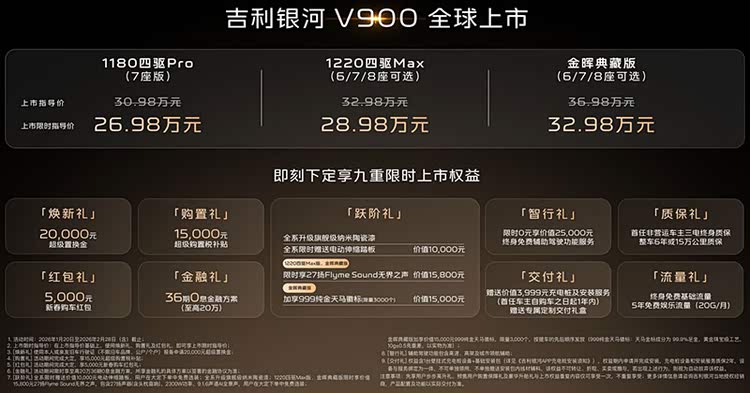 1月20日,吉利 银河V900(参数|询价)正式上市,三款车型,限时指导价26.98万到32.98万。这个价格一出,市场反应不小。毕竟,一台车长超过5米2、标配双电机四驱和空气悬挂的MPV,能把门槛拉到30万内,本身就是一个强烈的信号。但价格只是敲门砖,今天我们不聊虚的,就掰开揉碎看看,银河V900到底拿出了哪些硬货,这些硬货又是不是家庭用户真正需要的。