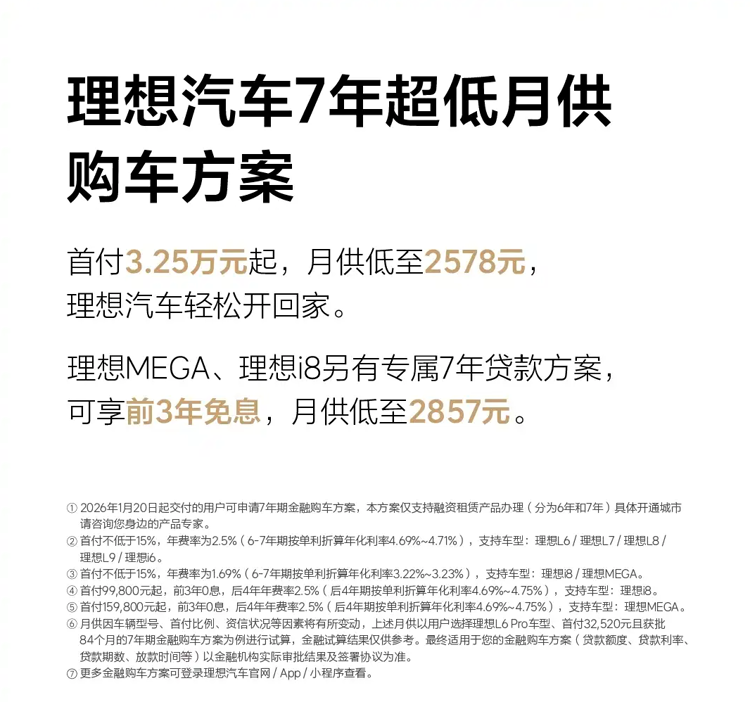 车家号·0浏览·2026-01-20 22:24 · 上海想买理想的朋友可以等等看了,近日,理想正式推出7年超低月供购车方案,还针对MEGA、L8两款车型给出前三年免息福利,这波政策看似门槛降低,实际值不值得冲,得好好扒一扒。