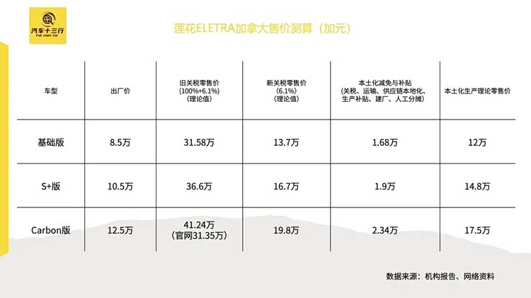 707辆的成绩证明在关税高墙下纯粹靠卖车一定是边缘化,但如果加拿大能通过此次政策调整,推动莲花在当地建立合资工厂或技术中心,局面将瞬间反转。按照新关税计算,三款车型的售价约13.68 万加元、约16.7万加元、约19.84万加元,高配版降幅接近60%,若依托吉利北美布局或合资建厂实现本土组装,进一步规避进口环节成本,理论上价格分别会下降至12万加元、14.8万加元、17.5万加元。