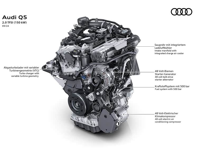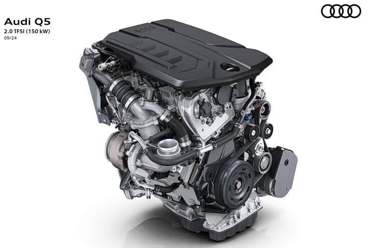 而低配车型则和A5L一样搭载低功率的EA888 2.0TFSI发动机(DXF),账面数据为150kW/340Nm,虽然没有MHEV PLUS轻混系统,但同样配备VGT可变几何截面涡轮增压器,并通过优化米勒循环提高整机燃烧效率。