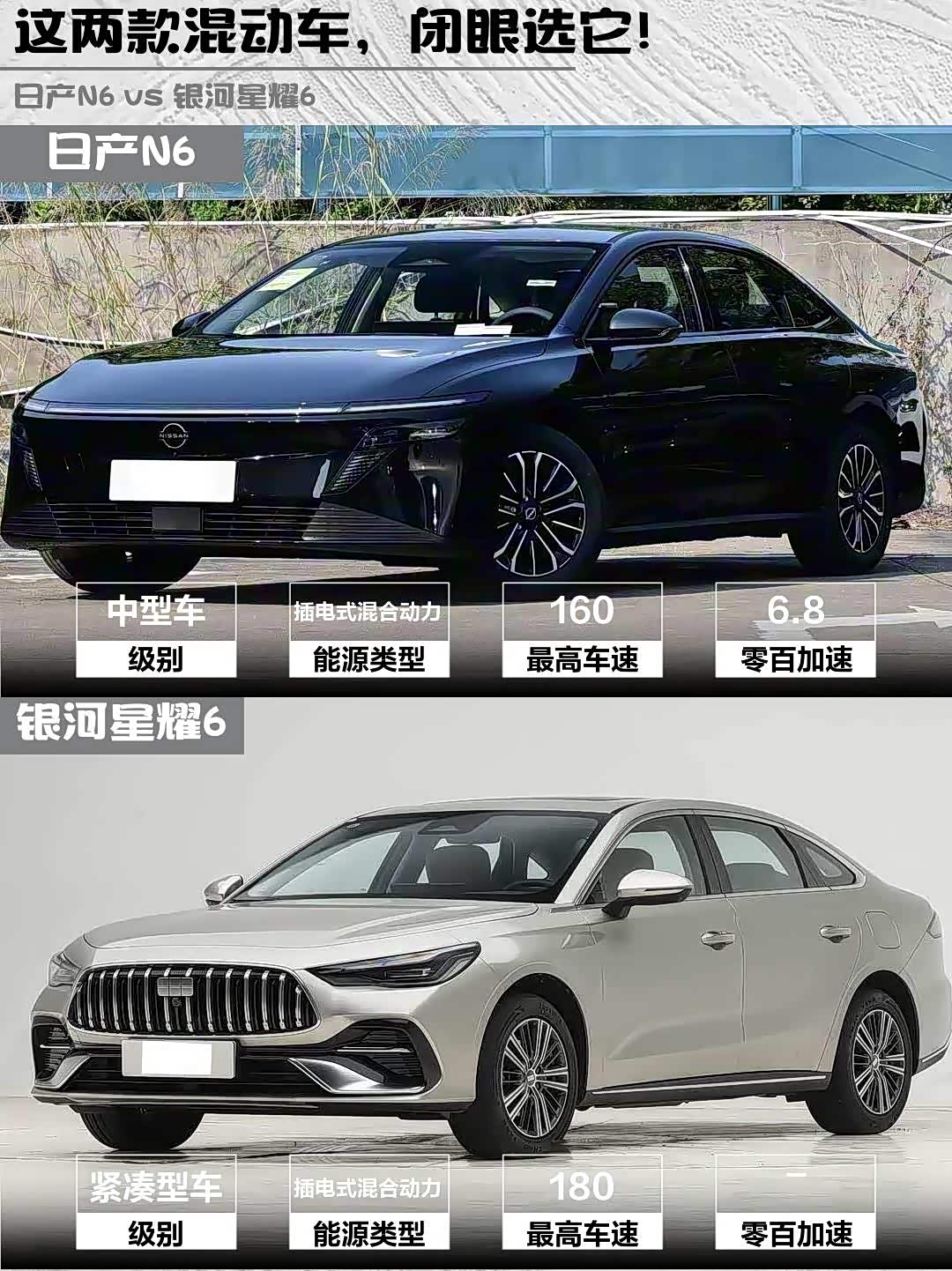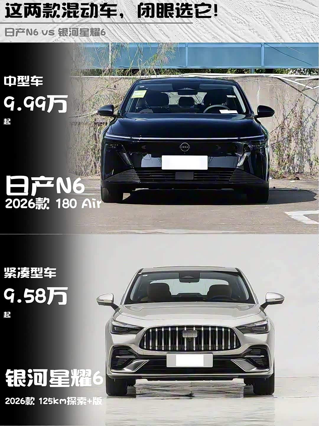 最近在选插混车的小伙伴看过来!今天给大家深度对比两款10万级热门选手——日产N6 2026款 180 Air和 银河星耀6(参数|询价) 2026款 125km探索+版,实测干货直接上菜!🔥
