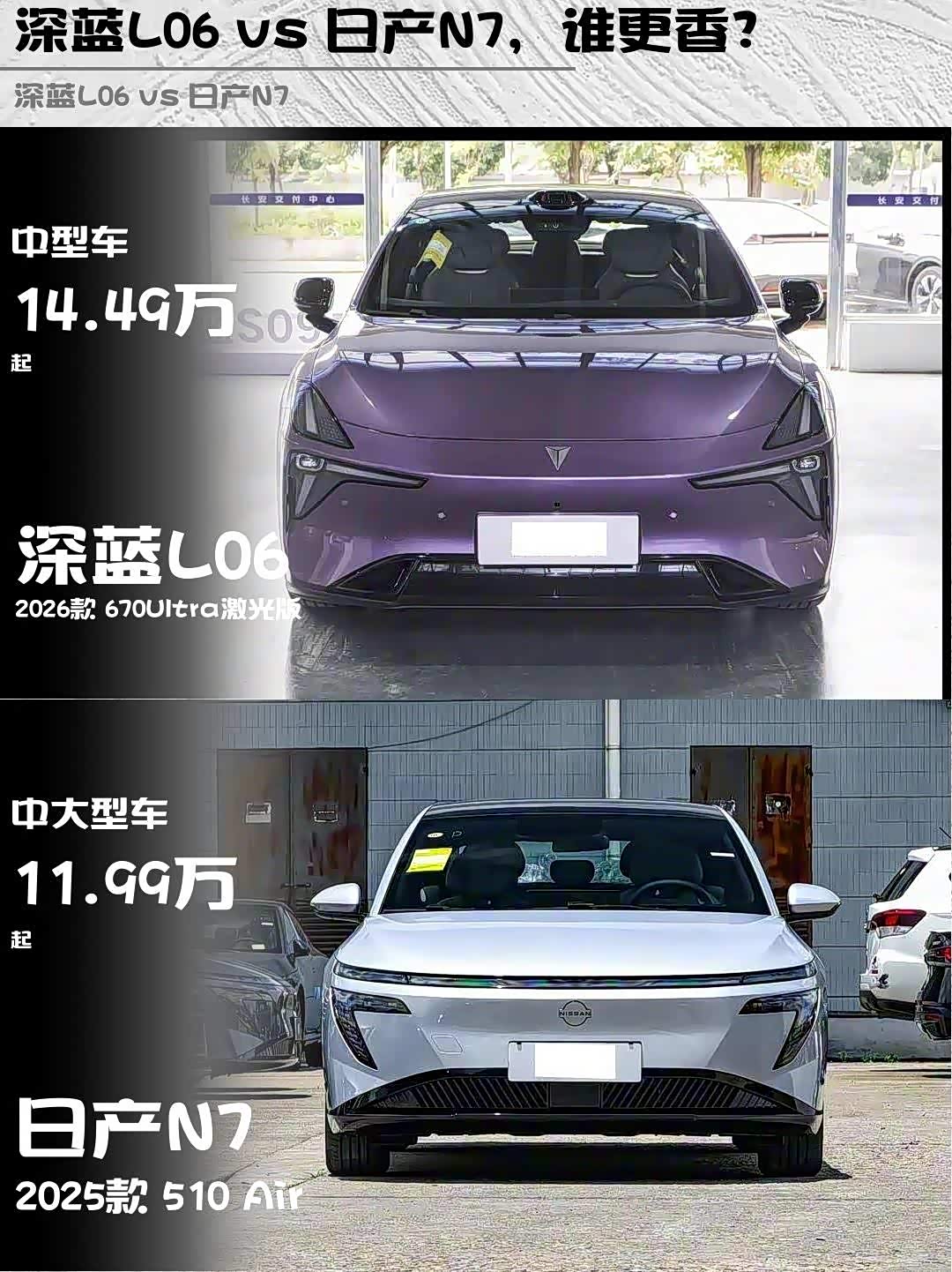 最近深度试驾了两款热门纯电车型—— 深蓝L06(参数|询价) 2026款 670Ultra激光版和日产N7 2025款 510 Air,作为15万级电动车的两大代表,它们各自的特点实在太鲜明了!🔥