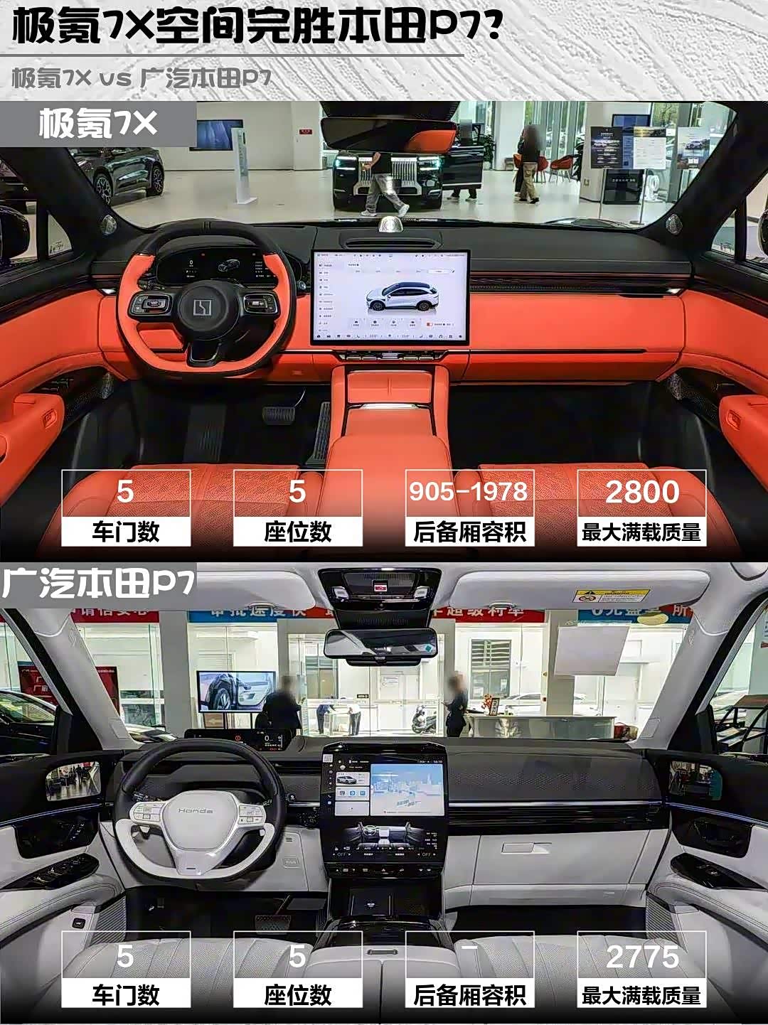 价格方面,极氪7X贵3万(22.98万 vs 19.99万),但多了激光雷达、HUD、座椅按摩等配置。本田P7降价后性价比突显,适合预算有限又想要大空间的用户。