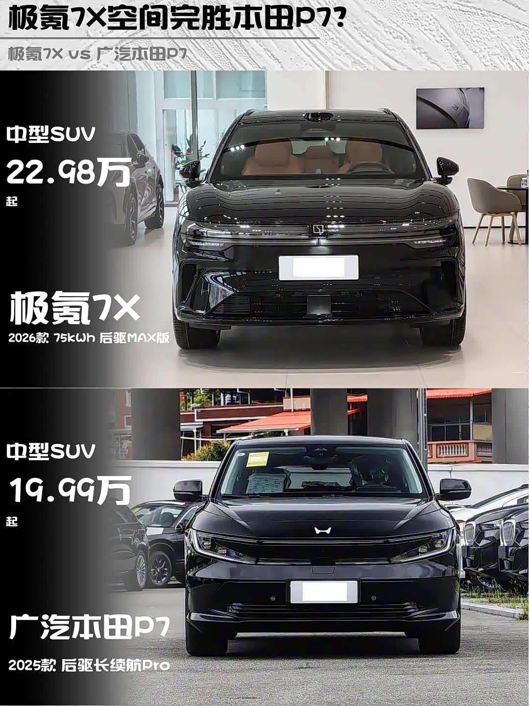 车家号·0浏览·2026-01-21 08:25 · 北京最近深度试驾了两款热门纯电SUV——极氪7X 2026款 75kWh 后驱MAX版和 广汽本田P7(参数|询价) 2025款 后驱长续航Pro,发现这两台车性格差异太明显了!🔥