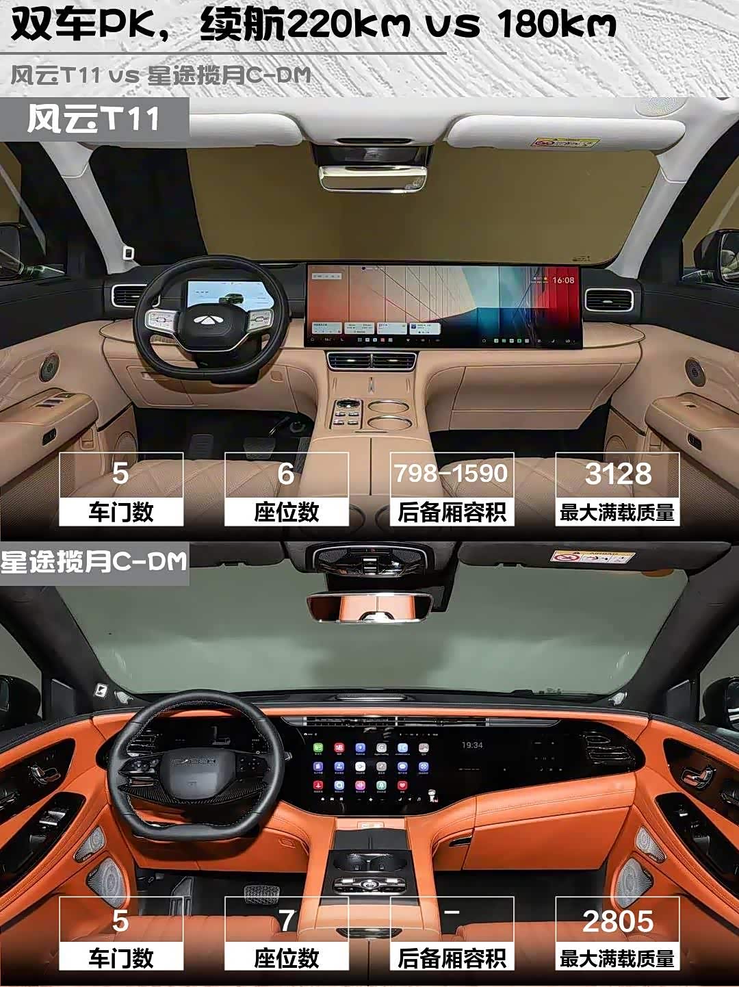 风云T11的5.2米车长+3.1米轴距,第三排实测180cm身高还能跷二郎腿😱 二排20cm通道设计,老人上下车不用侧身挤。最绝的是放倒座椅秒变1.8米大床,露营直接当房车用!相比之下揽月C-DM的第三排更适合170cm以下,七座状态下后备箱只能塞两个登机箱。不过揽月的NAPPA真皮座椅按摩力度更带劲,适合长途驾驶。