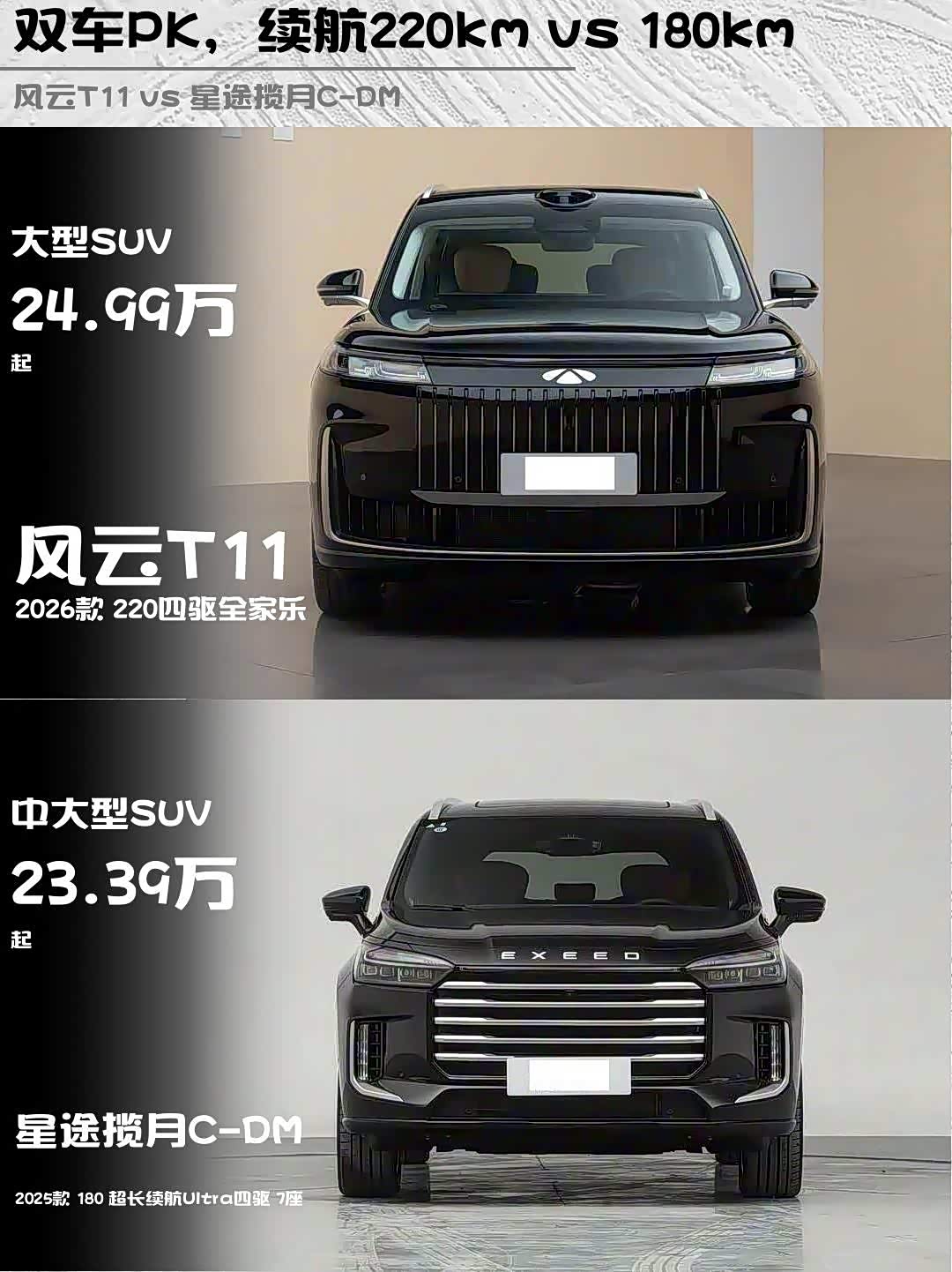 最近在选家用大六座SUV,深度试驾了风云T11 2026款 220四驱全家乐和 星途揽月C-DM(参数|询价) 2025款 180超长续航Ultra四驱7座,两款都是25万级国产混动旗舰,但性格差异太明显了!给纠结的兄弟们来个硬核对比👇