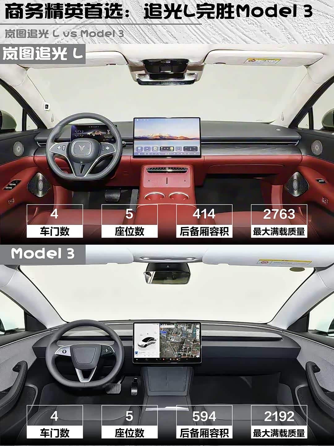 岚图轴距3米,后排能跷二郎腿,副驾零重力座椅躺平午休超爽!但储物空间少,手机没地放😅。Model 3后排头顶局促,后备箱594L更大,前备箱还能藏包包。岚图内饰豪华,实木饰板+丹霞红配色;Model 3极简风像“毛坯房”,塑料感略强。