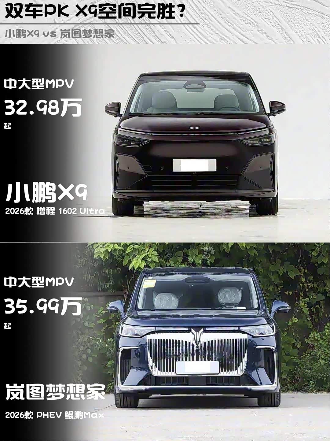 车家号·0浏览·2026-01-21 08:38 · 北京最近身边不少朋友都在纠结选MPV,作为深度体验过小鹏X9 2026款增程1602 Ultra和 岚图梦想家(参数|询价)2026款PHEV鲲鹏Max的老司机,必须来波干货对比!🚗💨