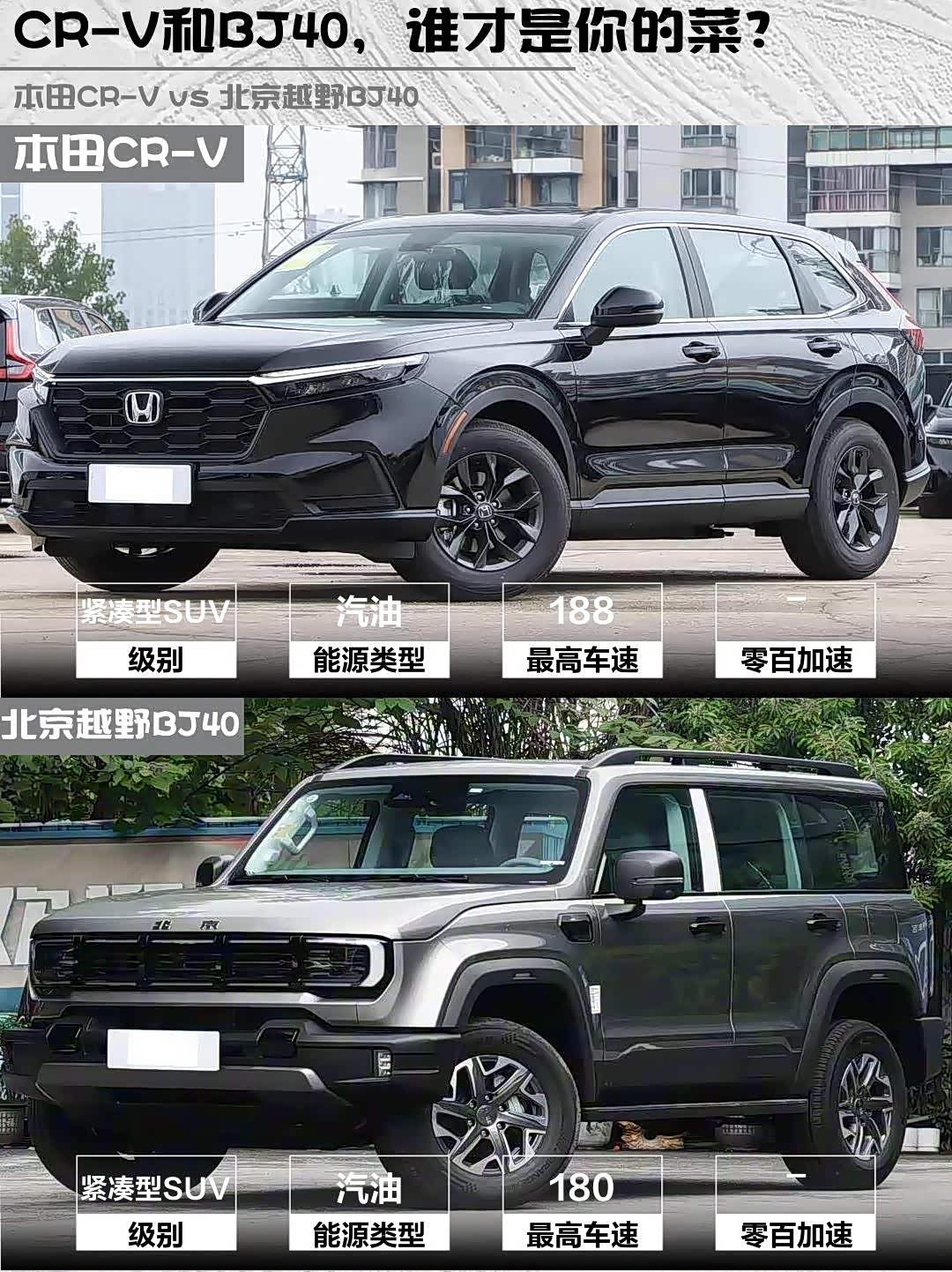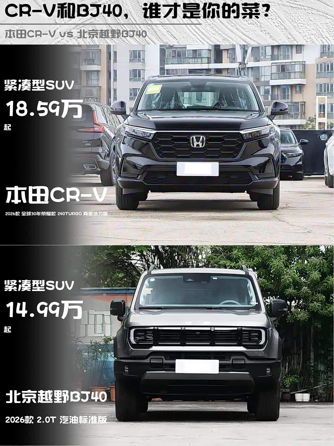 最近在选车的小伙伴看过来!今天给大家深度对比两款热门SUV:本田CR-V 2026款 全球30年荣耀款 240TURBO 两驱活力版 vs 北京越野BJ40(参数|询价) 2026款 2.0T 汽油标准版,看完这篇你就知道哪款更适合你!🔥
