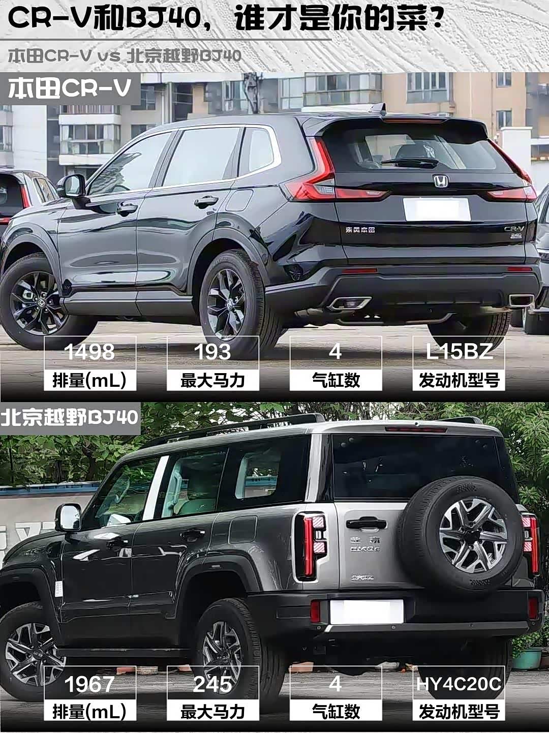 CR-V指导价18.59万终端优惠5万+,实际17万落地真香!BJ40标价14.99万但选装差速锁+越野包直奔18万。想要省心家用闭眼CR-V,硬核玩家直接冲BJ40改装!