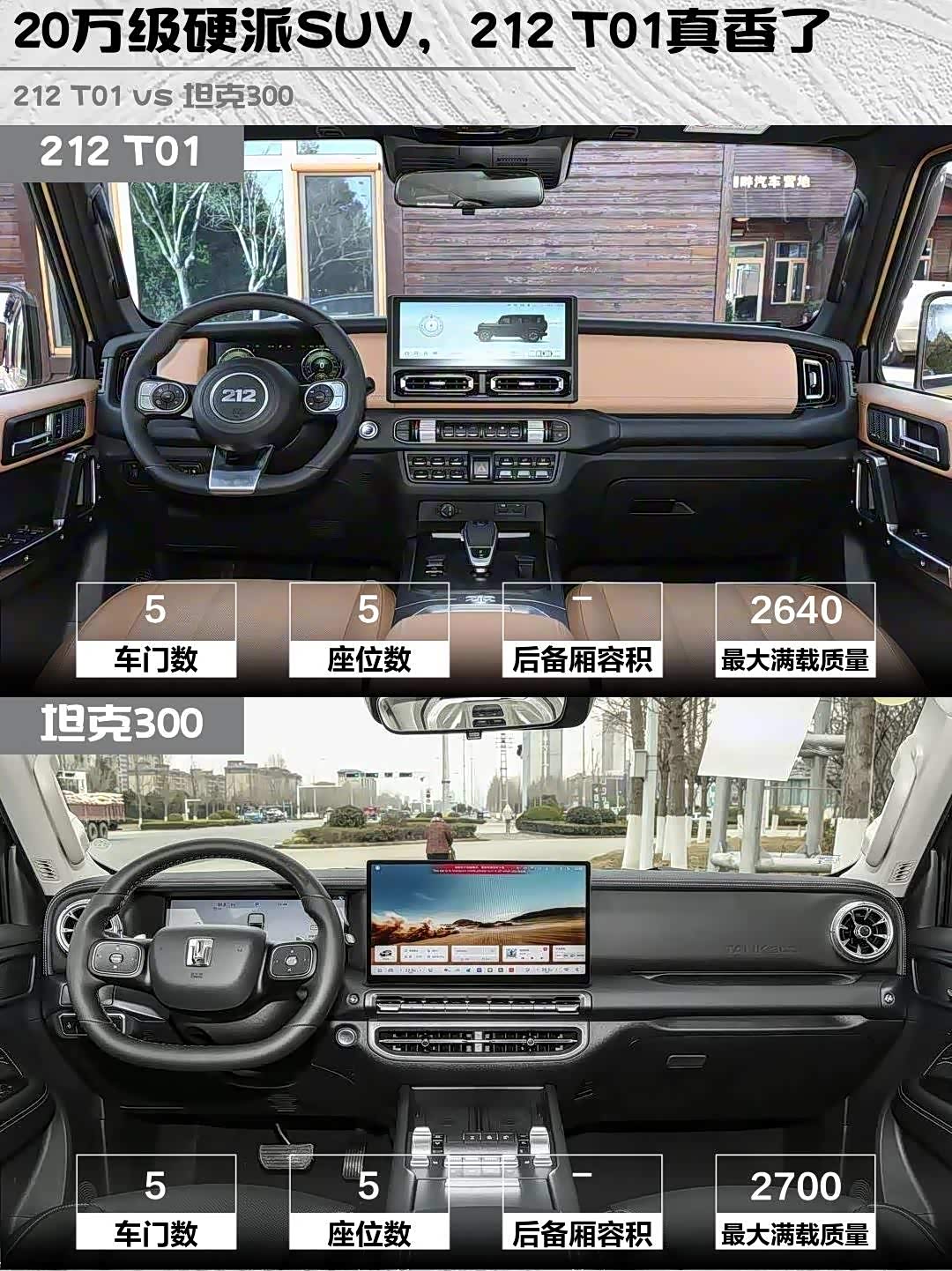 最后说价格:212 T01高地20.58万 vs 坦克300挑战者19.98万。要纯粹机械感选212,要智能舒适选坦克300。我最后选了212,毕竟加油时钱包疼的哆嗦也是一种快乐(不是)🤣