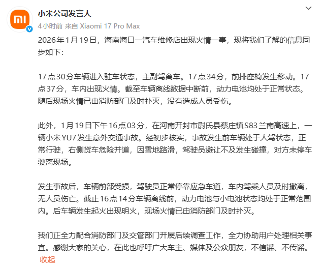 1月20日,小米公司发言人发布声明,就1月19日发生的两起车辆起火相关事件作出回应,并详细披露了事件经过及初步核查情况。第一起发生在海南海口一汽车维修店,17点30分车辆进入驻车状态,17点34分前排座椅发生移动,17点37分车内出现火情。截止车辆离线数据中断前,动力电池均处于正常状态。现场火情已由消防部门及时扑灭,没有造成人员受伤。