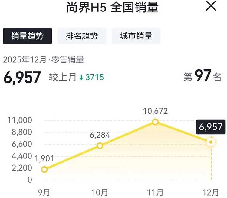 2025年12月份,尚界H5的销量为6957辆,相比2025年11月份的销量10672辆,环比下滑34.81%。