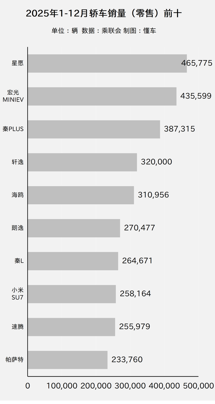 篇幅所限,12月轿车销量这里就不多聊了,下面是2025年轿车销量前十榜的解析: