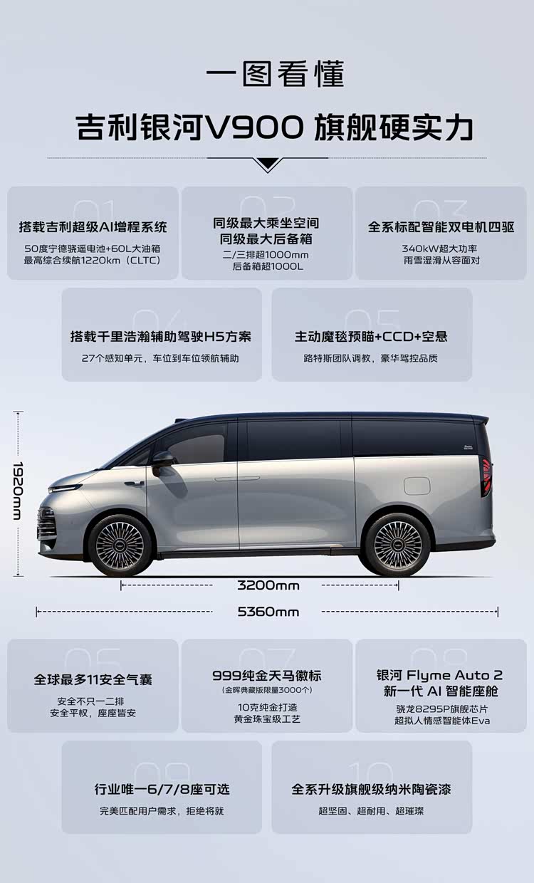 整个发布期间,“空间”成为关于吉利银河V900出现最多的词语之一。吉利银河V900也名副其实,其空间优势集中体现为“3个1000+”行业首创全球最大空间及多项同级第一。首先二三排纵向空间均超1000mm,1.8米大长腿可惬意舒展。其次后备箱超1000L,可容纳15个20寸行李箱,另有163L下沉储物空间。车内尺寸方面,吉利银河V900车内高1334mm、有效长度3.97米、有效面积8.41平方米,同级最大,彻底让MPV告别拥挤。