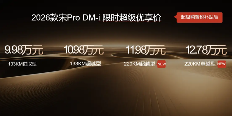 2026款宋Pro DM-i则聚焦“全家舒享”,在原有大空间基础上,优化底盘调校与座舱静谧性,并可选装智能冷暖冰箱、座椅按摩等配置,满足家庭用户对舒适出行的更高要求。