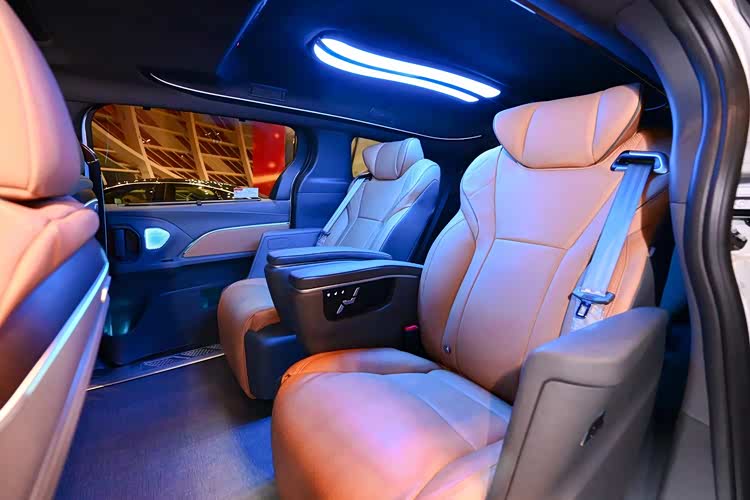升级定制豪华航空座椅,标配原车安全气囊,支持电动调节躺平模式,兼具通风、加热、智能按摩功能;配备劳斯莱斯同款星空顶采用进口麂皮绒材质,搭配高级冲孔工艺,车内顶部空间提升 4-6cm,内部空间更开阔;具备流星、繁星等多种星空模式,支持声音联动控制。搭配 64 色氛围灯,支持车机、手机等多端控制,多种场景一键切换。可选配吸顶娱乐系统与智能座舱系统,兼顾商途高效与家旅舒心。