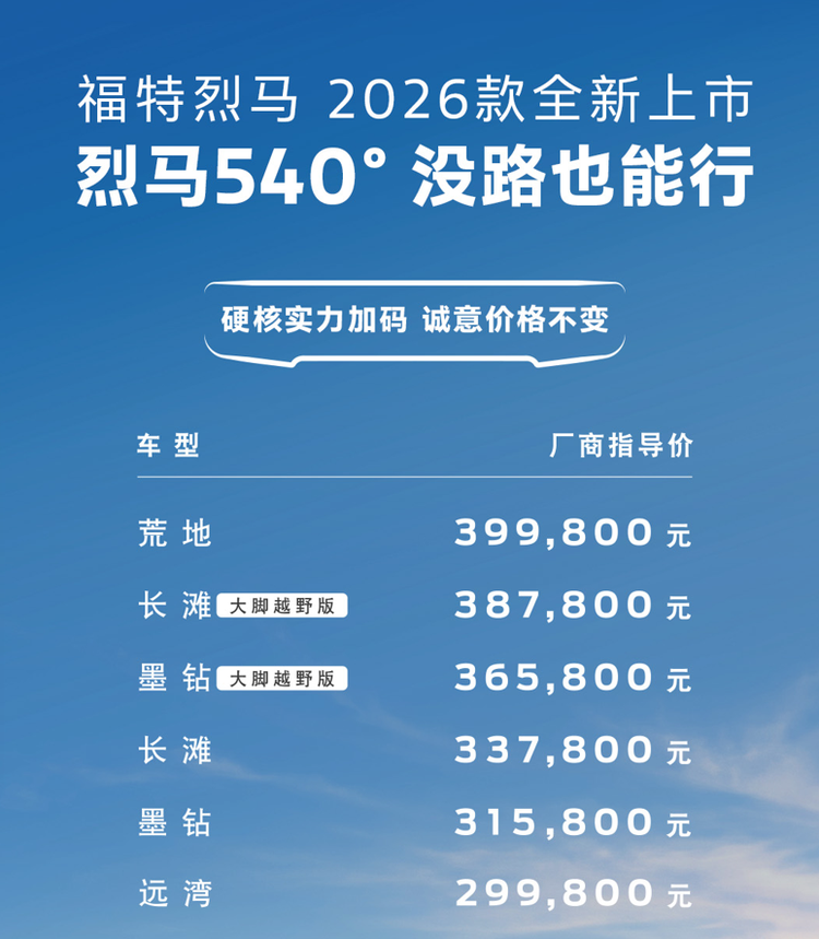 相对于目前同级在售的越野车型来说,强大的赛事基因、优异的拓展性都已经成了福特烈马的鲜明标签了,所以如果让你来选择的话,在这个价格区间,你会优先选择福特的26款烈马吗?
