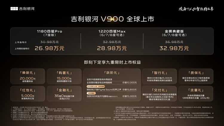 1月20日,吉利银河豪华V系列首发之作,“AI全场景家庭旗舰MPV”——吉利 银河V900(参数|询价)正式上市,共推出3个车型,上市限时指导价26.98万元-32.98万元。