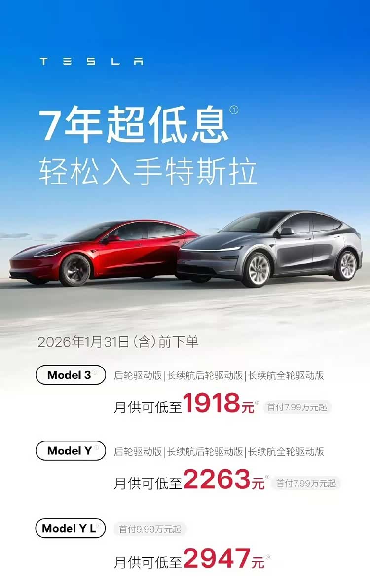 2026年,特斯拉瞅准时机继续加码,一边针对六座版的 Model Y L(参数|询价),推出了“五年免息”方案;另一边,更是针对Model 3与Model Y的后轮驱动版、长续航后轮驱动版、长续航全轮驱动版,以及六座版的Model Y L,首次推出了“七年超低息”方案。