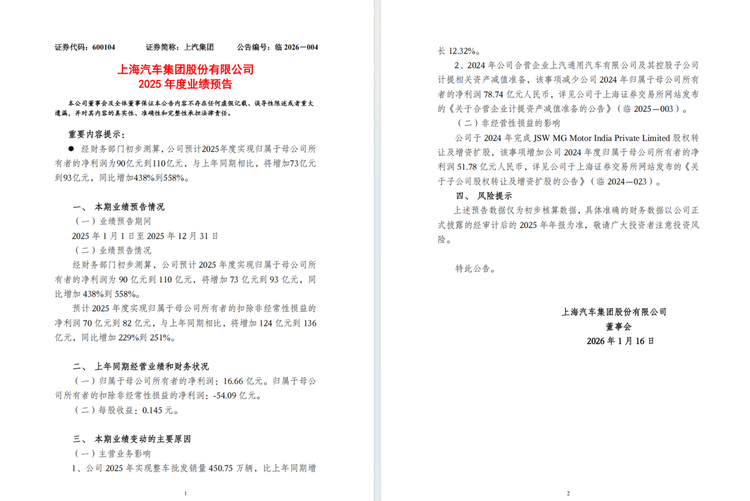 上汽集团又有钱了。2025年上汽业绩预告显示,预计全年净利润90亿至110亿元,同比增幅最高达558%,预计扣非之后的净利润为70亿至82亿元。