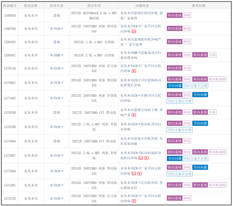 其二就是,本田引以为傲的品质正在遭受质疑。打开国内某知名投诉平台可以看到,东风本田CR-V、思域因转向系统异响遭到大量车主投诉。原因是,曾在2025年1月份,东风本田因转向机故障问题,宣布召回CR-V、HR-V、思域系列车型,共计856303辆。而根据目前车主投诉来看,召回更换转向机内部弹簧、注入润滑脂后,仍存在异响问题。