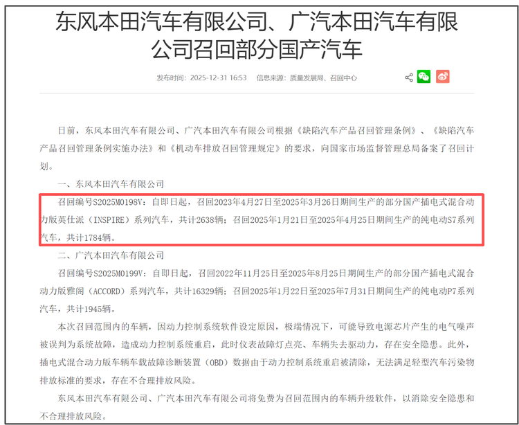 其实不止燃油车大规模召回,新能源也难逃质量缺陷——东风本田于25年12月31日宣布召回2638辆插混版英仕派、1784辆S7。原因是动力控制系统软件设定原因,极端情况下,可能导致电源芯片产生的电气噪声被误判为系统故障,造成动力控制系统重启,此时仪表故障灯点亮、车辆失去驱动力,存在安全隐患。解决办法是进行软件升级。